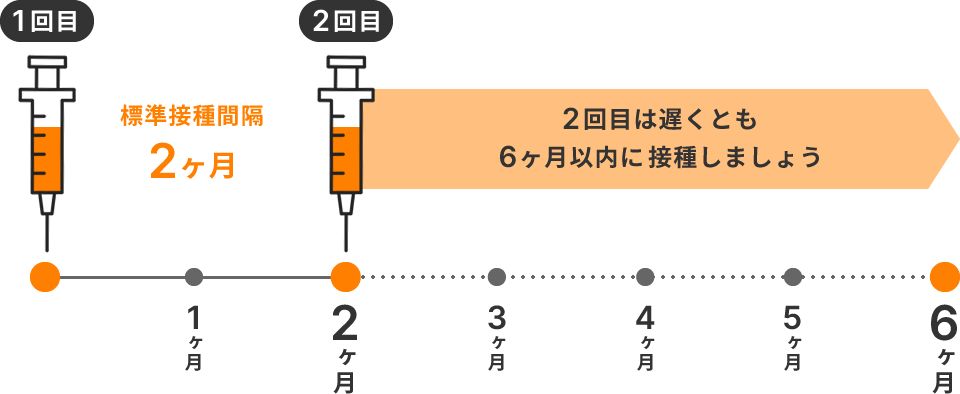 1回目の接種から2ヶ月あけて2回目を接種します。2回目は遅くとも6か月以内に接種しましょう。 ![]() 例) 1回目の接種が10月10日の場合、12月9日から2回目の接種が可能 |