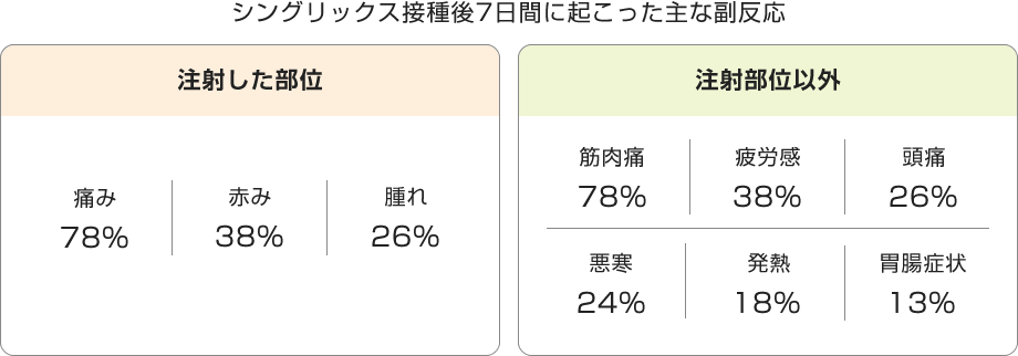 注射部位の痛みや腫れがあらわれますが、これは体内で強い免疫を作ろうとする仕組みが働くためと考えられます。多くは3日以内に収まります。