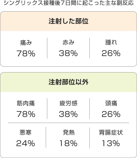 シングリックスの接種により健康被害が発生した場合は「医薬品副作用被害健康救済制度」により治療費等が支給される場合があります。詳しくは 独立行政法人医薬品医療機器総合機構のWebサイト をご覧ください